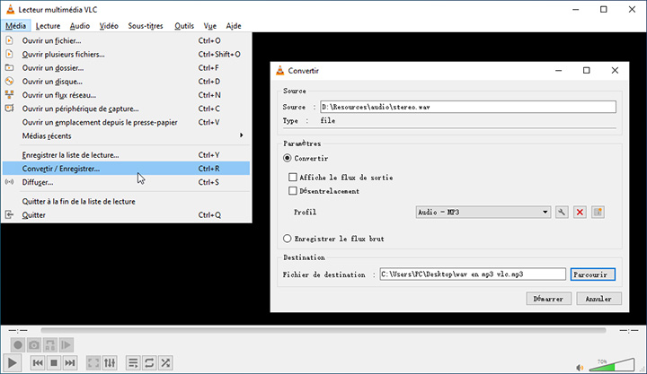 Vous pouvez convertir un fichier WAV en MP3 gratuitement en utilisant VLC media player. Ajoutez le fichier WAV en cliquant Média > Convertir/Enregistrer et sélectionnez Audio - MP3 comme le format de sortie. Cliquez sur Paramètres à droite pour modifier la qualité audio si nécessaire. Cliquez sur Démarrer pour lancer la conversion.