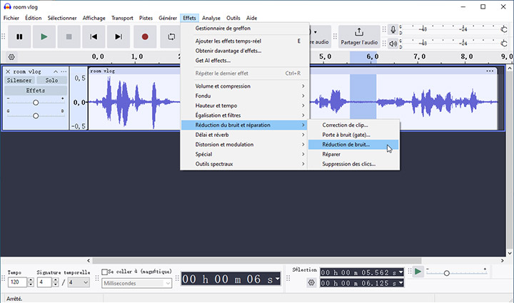 Étape 2 : Sélectionnez un profil de bruit en mettant en évidence une partie de votre audio où seul le bruit est présent (aucun autre son). Allez à Effet > Réduction du bruit et réparation > Prendre le profil du bruit.