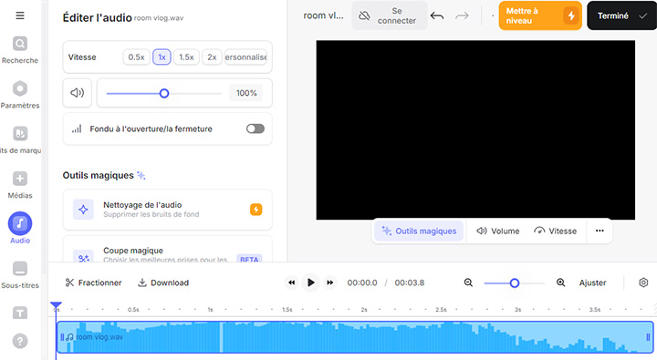 Étape 3 : Activez le Nettoyage audio en allant dans Audio > Outils magiques > Nettoyage de l'audio via le menu à gauche.