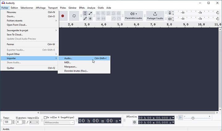 Étape 1 : Cliquez sur Fichier > Importer > Audio afin de charger votre fichier audio dans le programme.