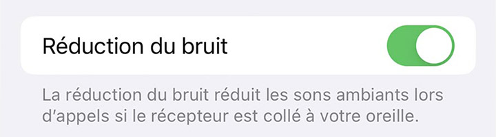 La réduction du bruit utilise la pression de l'air pour diminuer le bruit d'arrière-plan de votre environnement. Cela signifie que vous entendez mieux lorsque vous tenez le combiné près de votre oreille dans certains environnements bruyants. Cette fonctionnalité est activée par défaut sur les iPhone 12 et modèles ultérieurs, mais vous pouvez la gérer manuellement :