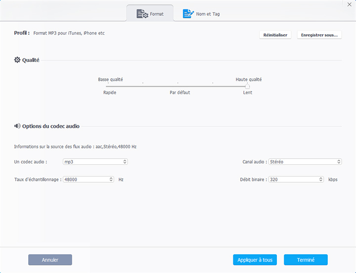 - Format audio de sortie : MP3, PCM, WMA, AAC, AIFF, AC3, sonnerie iPhone, etc.