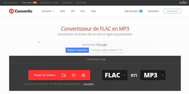 Les convertisseurs FLAC basés sur le Web peuvent également aider à convertir de petits fichiers FLAC en MP3 sans installer de logiciel. De nombreux convertisseurs FLAC en ligne proposent des services de conversion gratuits, mais avec des tailles de fichier de téléchargement limitées. Avec Convertio, vous pouvez télécharger et convertir des fichiers FLAC jusqu'à 100 Mo. Et la vitesse de conversion dépendra largement des conditions de votre réseau.