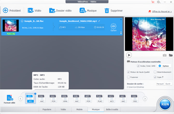 VideoProc Converter AI est un convertisseur FLAC en MP3 simple mais puissant. Avec l'aide de VideoProc Converter AI, vous pouvez convertir des fichiers FLAC en MP3 sans perte de qualité. Ce programme prend également en charge la conversion de fichiers multimédias par lots. Cela vous fera économiser beaucoup de temps et d'efforts. De plus, avec la technologie d'accélération GPU de niveau 3, VideoProc Converter AI assure une vitesse de conversion ultra-rapide. En plus de la conversion FLAC en MP3, VideoProc Converter AI inclut un outil automatique de suppression du bruit de l'IA pour éliminer les bruits de fond et obtenir un son clair.