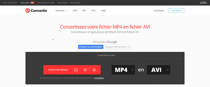 C'est également un excellent choix pour convertir MP4 en AVI en ligne avec Convertio. Cette méthode est particulièrement adaptée pour des utilisations occasionnelles. Il n'est pas nécessaire d'installer de logiciel sur votre PC. La plupart des outils en ligne sont faciles à utiliser et compatibles avec n'importe quel navigateur.