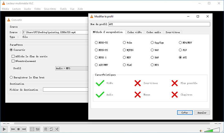 Étape 5. Terminez les paramètres du fichier de destination et commencez à convertir MP4 en AVI avec VLC.