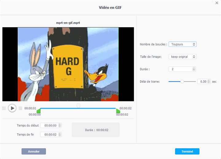 Astuce : Si vous souhaitez éditer la vidéo avant de la convertir en GIF, vous pouvez sélectionner un format vidéo tel que MP4 et cliquer sur le bouton Option pour couper, rogner et appliquer d'autres modifications à la vidéo. Cliquez sur Terminé pour enregistrer la vidéo modifiée, puis importez-la à nouveau pour utiliser la fonction GIF.