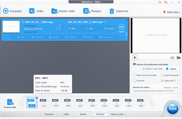 VideoProc Converter AI est un outil de traitement vidéo puissant mais facile à utiliser qui prend en charge la conversion de MPEG en MP3 en quelques étapes. Il permet la conversion de presque tous les formats vidéo et audio tels que MP4, MOV, WEBM, MKV, WAV, MP3, M4R, M4A, WMA, OGG, FLAC, ACC, AC3, etc. Sa technologie d'accélération GPU unique permet de convertir très rapidement de grandes vidéos en d'autres formats vidéo et audio.