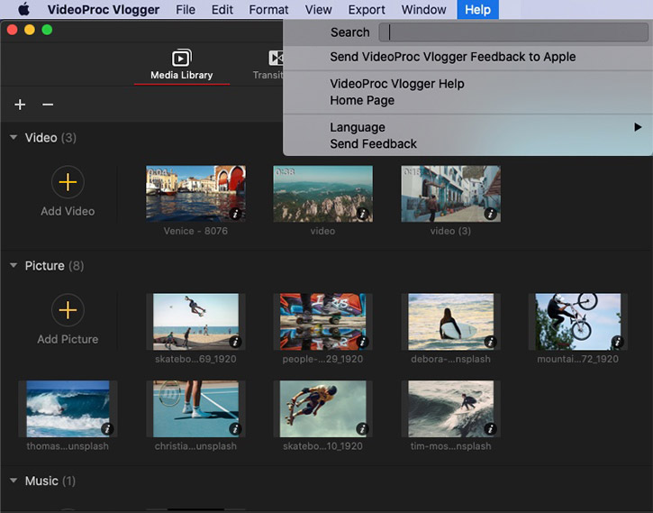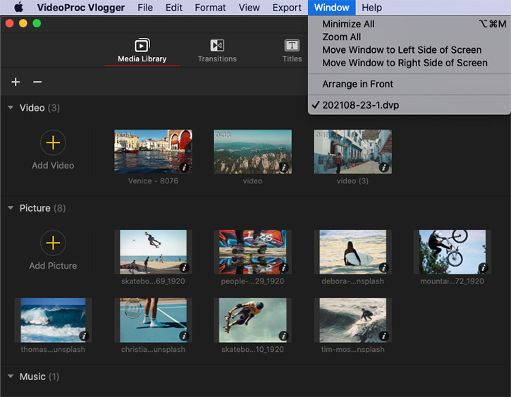 Window: It allows you to minimize, zoom, and move the entire window of VideoProc Vlogger. Also, it shows the current project name and you can switch to the Finder menu via this option..