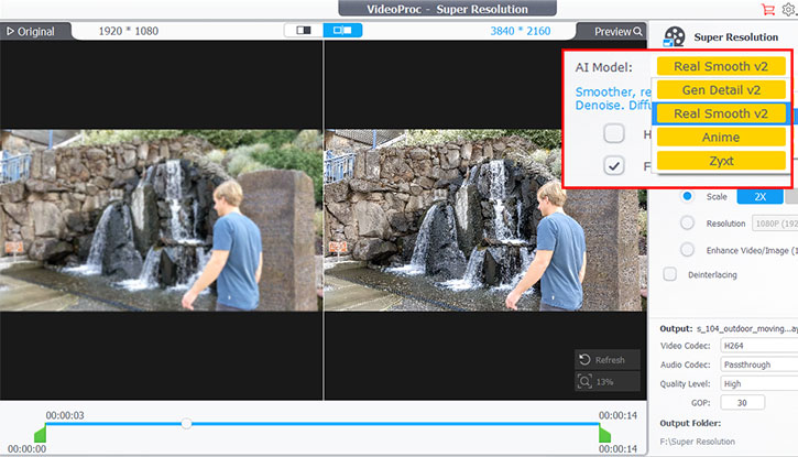 4. Shoot your video at the highest possible resolution as you can. If not, upscale it to 4K through post-processing. This is because YouTube will apply a different codec compression to videos that appear to be 4K and they will play much clearer. By the way, VideoProc can also help upscale video to 4K.