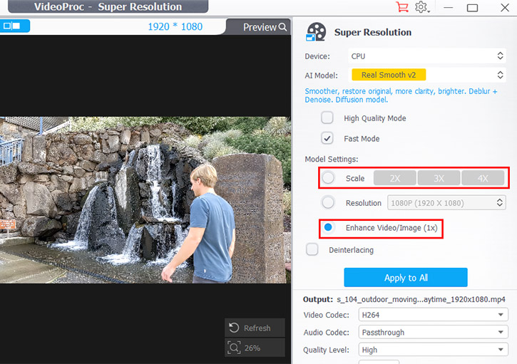Step 5. Choose 1x to enhance, or the upscale option 2x, 3x, and 4x under Model Settings to fix your blurry GoPro videos.