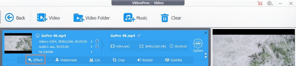 1. Use YouTube recommended upload encoding settings to get the best results. If your GoPro footage doesn't conform to those standards, you can use VideoProc to convert and process it. This tool won't lead to quality loss while transcoding and editing videos. It allows you to change encoding format, frame rate, bit rate, and aspect ratio to fit for YouTube, improve GoPro video quality through stabilizing shaky parts, reducing background noise, and correcting distorted fisheye effect, and do some edits like cutting, cropping, merging, splitting and adding filter.