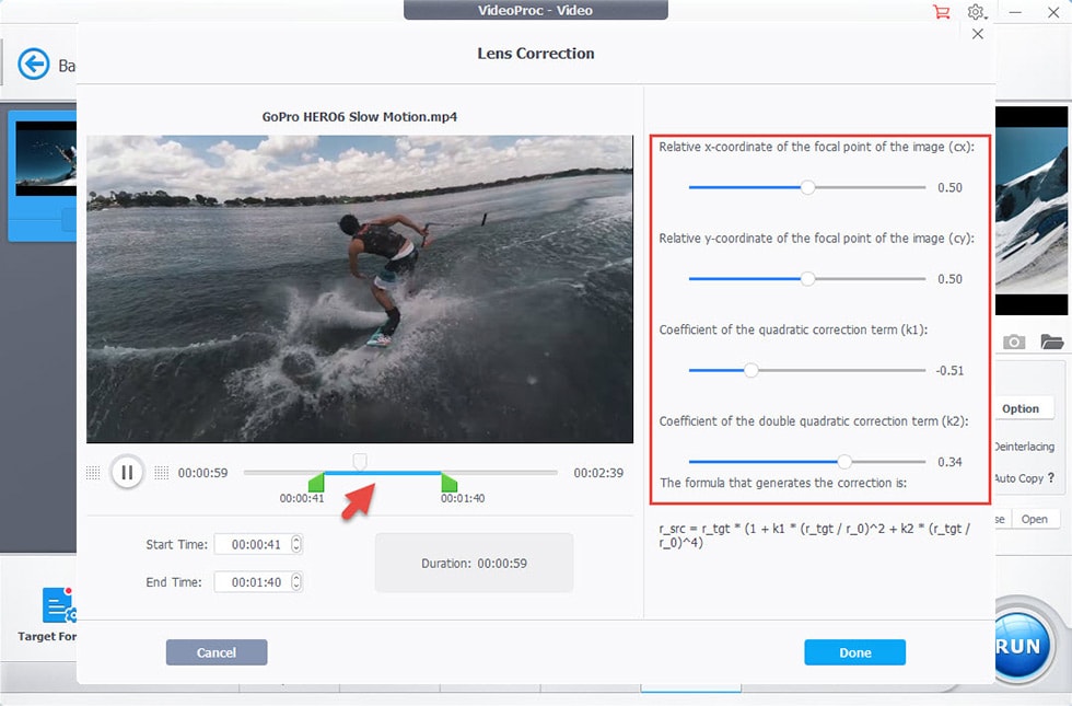 Step 2: Click the "Toolbox" at the bottom of the interface. Then double-click "Fisheye" button to enable GoPro fisheye removal lens option. In the result window, you can set the fractions of cx and cy to determine the central point of your GoPro video and adjust the coefficients of the (double) quadratic correction in k1 and k2 to zoom in or out focal length, so as to straighten the distorted edges horizontally and vertically. You can preview the defished fisheye video in real-time at the left of window. Additionally, you can move the bars below the preview window or enter in start time and end time to cut off unwanted GoPro videos. Once finished, click "Done".
