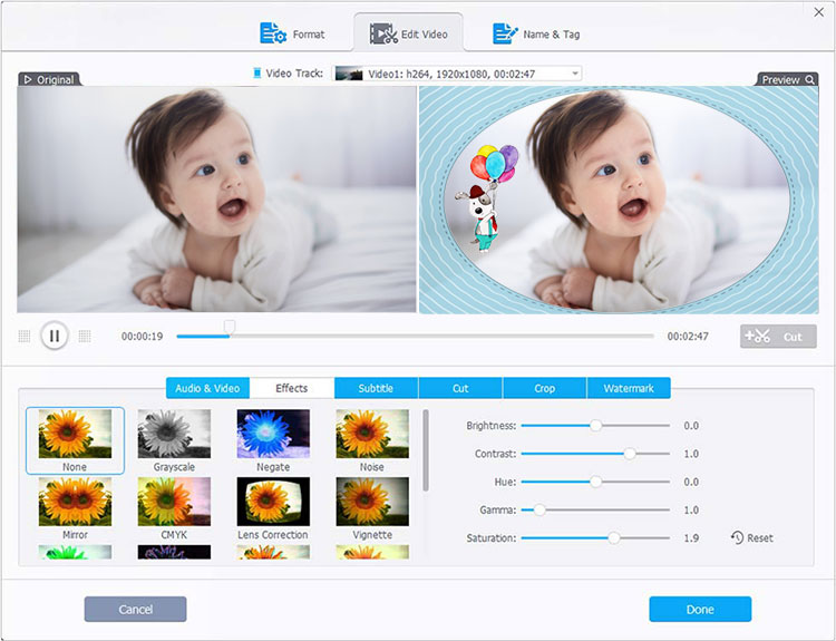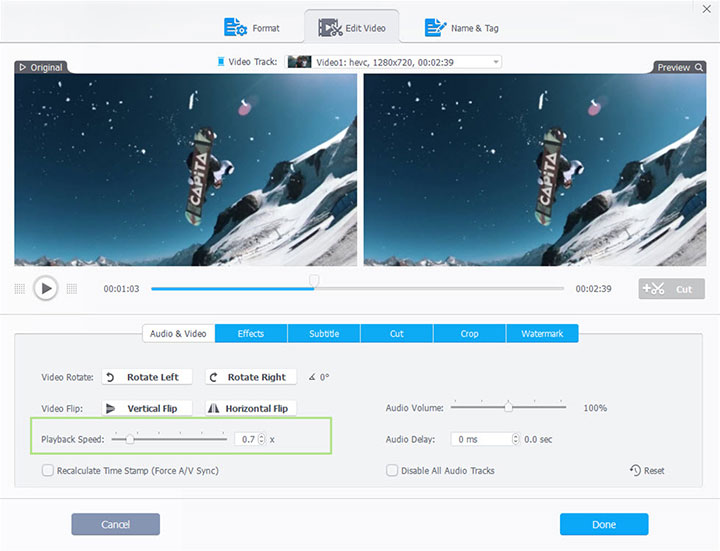 VideoProc Converter AI is a professional GoPro video editing tool and very easy-to-operate even for novice users. You can use it to cut, trim, crop, merge, rotate and flip, stabilize GoPro video, add effects, subtitle, watermark to GoPro video; create timelapse, slow motion GoPro video by changing video speed; adjust video brightness, contrast, hue; export the edited GoPro video to MP4 H.264 or any preferred format.