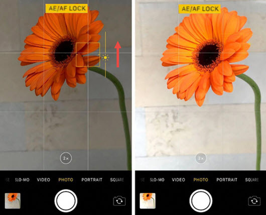 Step 2. Tap on that sun icon and swipe it up and down to adjust the brightness. If it is not ideal, you can tap on the screen again to slightly change the focus point, and re-adjust the exposure level.