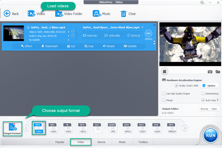 Tick Nvida / Intel / AMD to let the software make full use of Hardware Acceleration Engine. Tick "Auto Copy" for the fastest and 1:1 unchanged conversion. Then tap "RUN" button to start rendering and converting the video at the same time. It will be extremely fast (much faster than most other video editor programs).