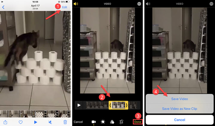Step 4: Tap Done, and select either Save Video or Save as New Clip. Save Video keeps the trimmed version of the video, while Save as New Clip keeps the trimmed video as well as the original video in your photo library. Note that both the original video and edited clip take up iCloud storage. You can delete the original if you don't want it anymore.