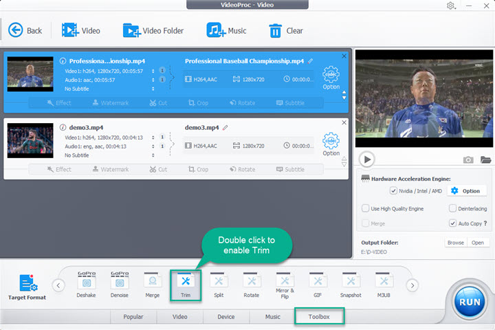Specify a destination folder to save the trimmed footage, and click the RUN button to start to chop off unwanted part from your iPhone video. This completes the procedure for trimming/cutting iPhone footages. The time it takes also depends on the video length. After trimming, you can use VideoProc Converter AI to merge separate iPhone clips into one video file.