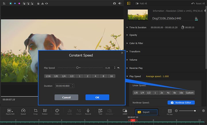 VideoProc Vlogger provides three ways to adjust linear speed.