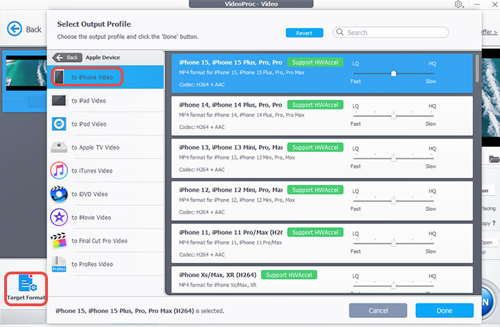 Step 3. Click Target Format > Apple Device, and then select the model of your iPhone. VideoProc Converter AI will automatically set the best video settings, including bitrate, frame rate, format, codec, etc., for your iPhone.