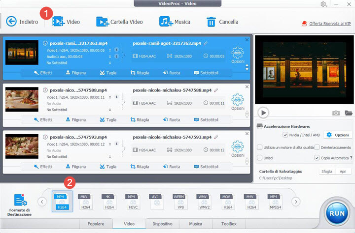 Step 5. Bene, adesso avrai tutti i file video tagliati e sistemati. Ma non dimenticare di controllare la funzione Auto Copy, che si trova sul lato destro dell'interfaccia, che si assicurerà che non ci siano codifiche, ripristini e perdita di qualità. Basterà cliccare, infine, sul pulsante RUN per far sì che VideoProc Converter AI inizi ad elaborarli tutti.