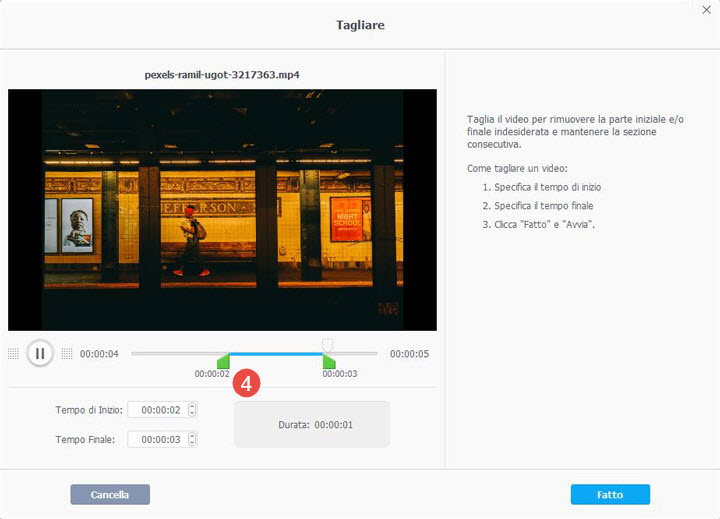 Fai doppio clic su di essa e si aprirà la pagina per tagliare il video. Qui potrai spostare i due cursori verdi, o impostare il punto di Inizio e il punto di Fine.