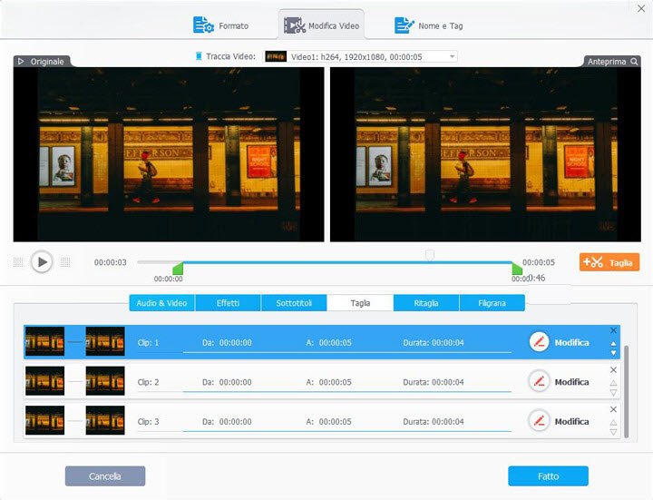 | Tagli Multipli | No. È possibile tagliare solo l'inizio e la fine del video. | Sì. È possibile tagliare diversi pezzi da un video: • Unisci insieme i pezzi; • Salva come clip singole. |