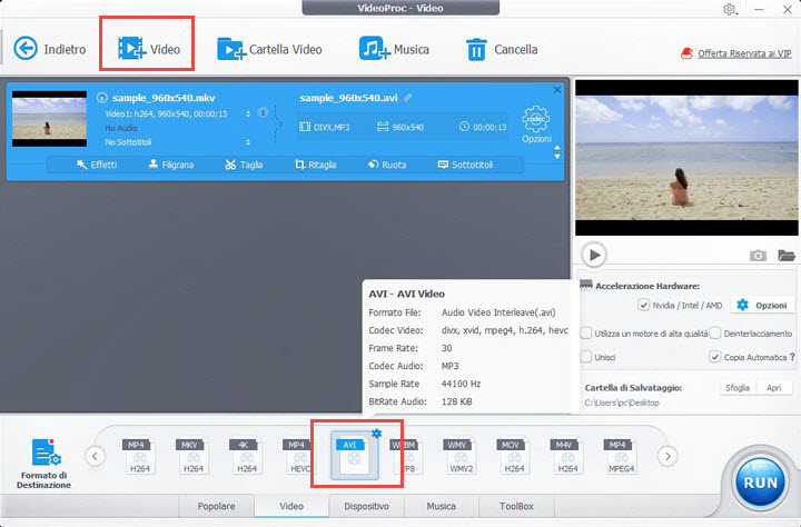 Per il remux video (sostituire il formato contenitore MKV con AVI senza ricodifica), utilizza il codec dello stesso tipo del video sorgente MKV. Puoi abilitare l'opzione di copia automatica in VideoProc Converter AI per effettuare il remux senza ricodifica.