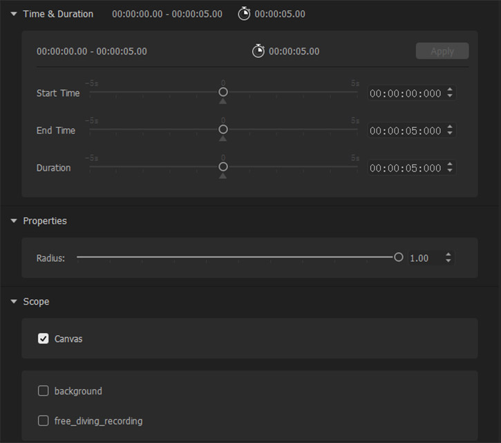 • Time and Duration: It enables you to change the start time, end time, and duration. Alternatively, you can move it in Effect Track to change the start/end time, and drag its edges to extend or shorten the effect.