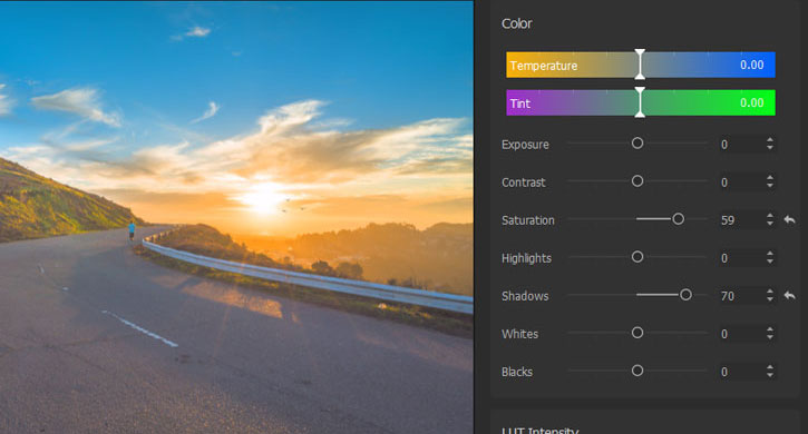 • If necessary, drag the slider of Intensity under LUT Intensity left to adjust the filter strength, making the select filter less overpowering.