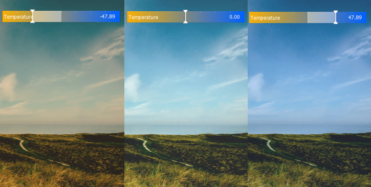 Drag the Temperature slider left to add the yellow color or right to add the blue color for making the picture seem warmer or colder.