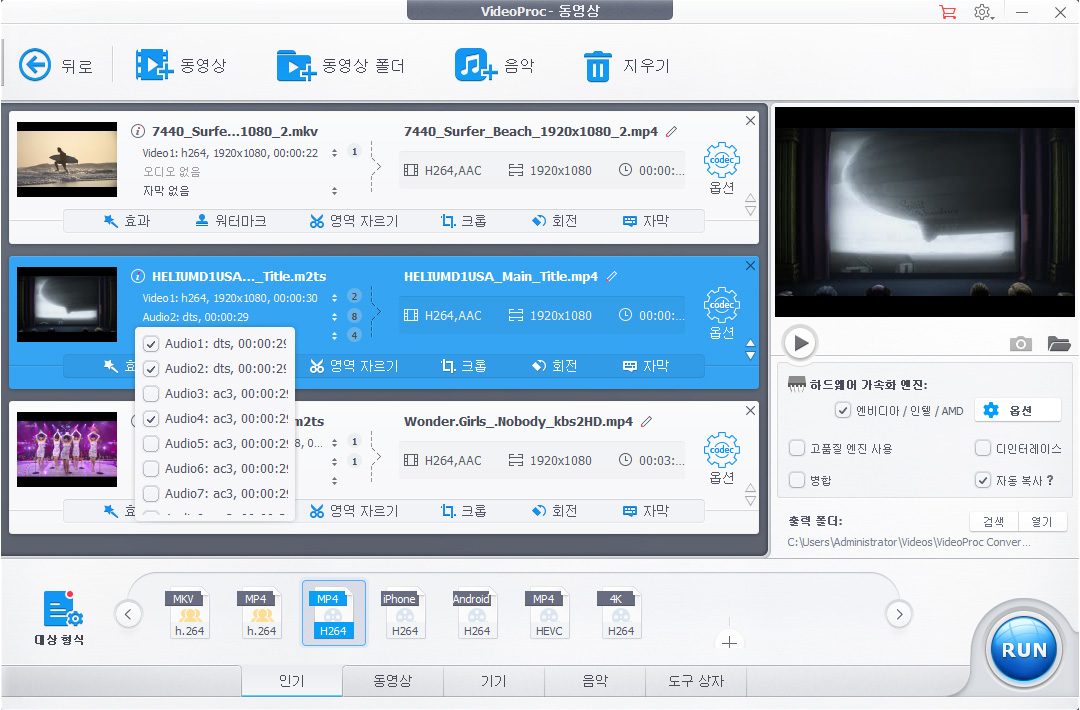 실시간 최대 47배 빨라진 속도를 즐겨보세요! VideoProc의 독보적인 기술은 파일 크기와 출력 비디오 품질을 최적화하면서 비디오 트랜스 코딩 및 처리를 더욱 가속화할 수 있습니다.