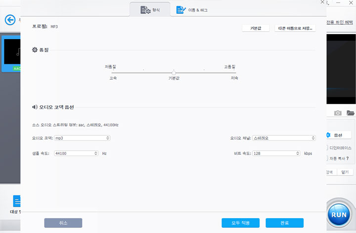 3단계. MP3 형식 아이콘을 더블 클릭하여 코덱 옵션을 실행합니다. 소스 M4A 파일과 동일하게 샘플 속도, 비트 전송속도, 오디오 채널을 설정합니다. 또한 음질을 향상시키기 위해 "음질" 아래의 슬라이더를 끌어다 놓을 수도 있습니다. "완료"를 클릭하여 변경 사항들을 저장합니다.