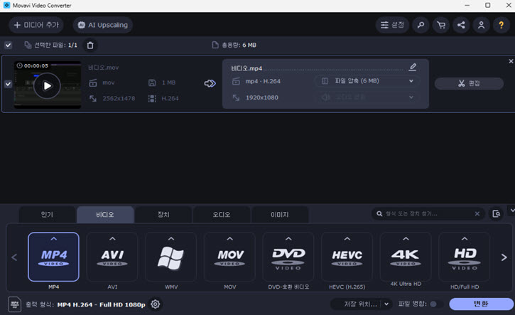 Movavi Video Converter는 직관적으로 MOV 영상파일을 손쉽게 MP4로 변환할 수 있는 탁월한 프로그램 입니다. 이 포스트웨어는 윈도우와 맥을 모두 지원하고, AI Upscaling 기능으로 작은 영상의 크기를 늘리는 것도 가능합니다.