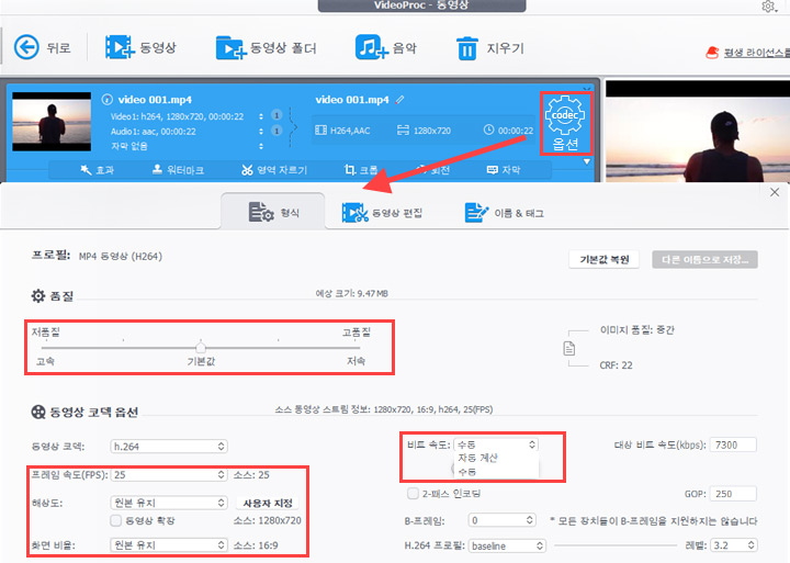 2단계. 동영상 매개 변수들을 수정 및 프리셋합니다.