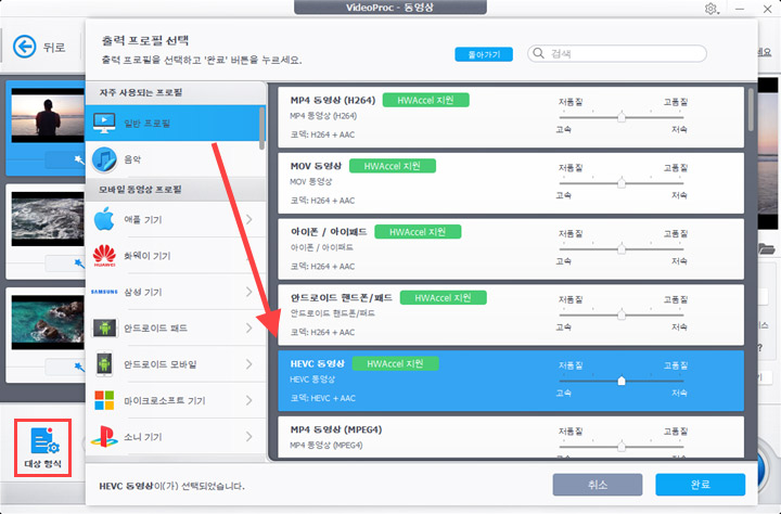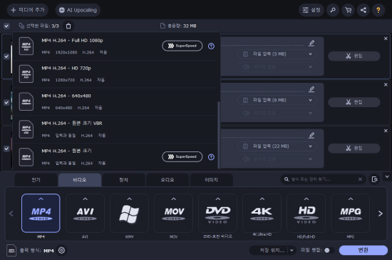 변환 작업을 시작하기 전에 비디오 탭에서 필요에 따라 원하는 파일 형식을 선택합니다. 프로그램 하단의 톱니바퀴 버튼을 파일 형식 외에 화면 비율, 해상도, 프레임 속도, 비디오 및 오디오 코덱 등을 원하는 대로 설정합니다. H.264 코덱 선택 시 영상 품질은 높고 크기는 작게 유지할 수 있습니다.