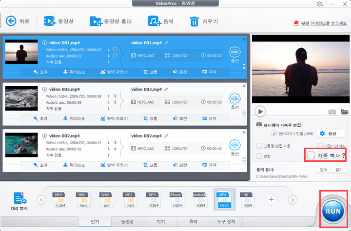 출력 형식으로 범용 형식인 'MP4'를 선택해야 한다는 점을 잊지 마세요.