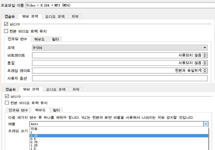 또한 여러분은 VLC에서 동영상 용량을 줄이기 위해 인코딩 매개 변수 아래에 있는 동영상, 오디오 비트 전송속도, 화질, 프레임률을 조정할 수 있는 렌치 아이콘을 클릭함으로써 더욱 고급 조정도 가능합니다. 또한 이는 해상도를 1/4, 1/2, 3/4으로도 낮출 수 있도록 합니다.