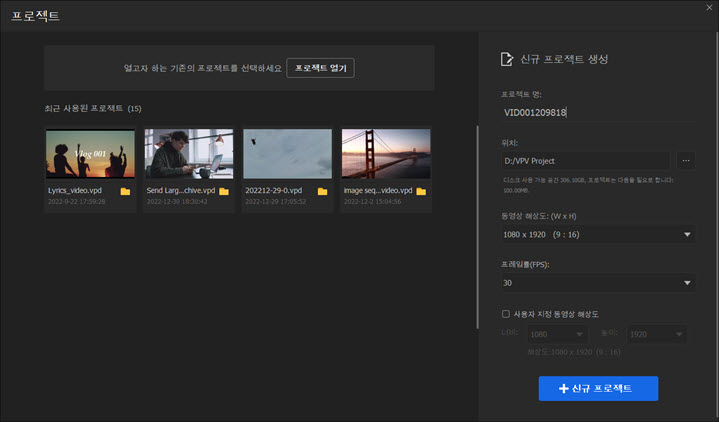 1 단계. 비디오프록 브이로거를 다운로드 후 설치합니다. 그러고 나서 프로그램을 실행한 후 새 프로젝트를 생성합니다.