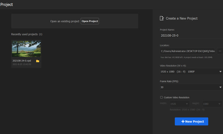 새 프로젝트를 만들고 이름, 위치, 동영상 해상도를 맞춤 설정합니다.