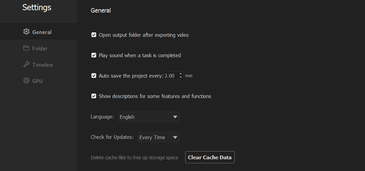 비디오프록 브이로거(VideoProc Vlogger)는 다양한 동영상 편집 습관들에 대한 기본 설정을 제공합니다. 여러분은 언어, 파일 위치, 편집 선호도, 하드웨어 가속화 등에 대해 기본값을 설정할 수 있습니다.