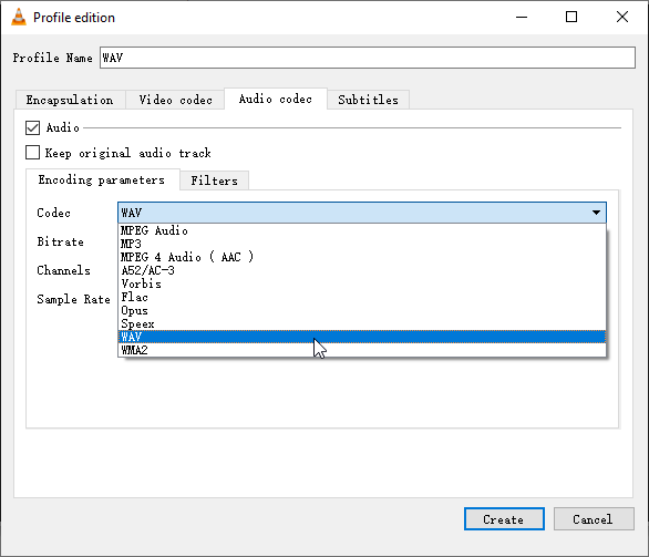 Step 3. Click the Create a new profile button. Input the Profile Name in the pop-out Profile edition window. Then select WAV as the Encapsulation. Enable the audio track, and select WAV from the Codec drop-down list. You can choose to adjust other encoding parameters. Click Create to save the settings.