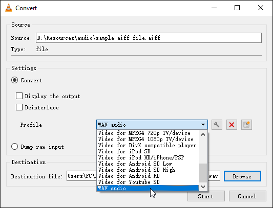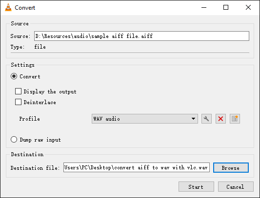 Step 5. Click the Browse button to set the save location of the output file. Then you can click Start to change AIFF to WAV.