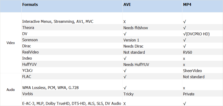Check the below comparison table to figure out the differences and similarities of AVI and MP4 format.
