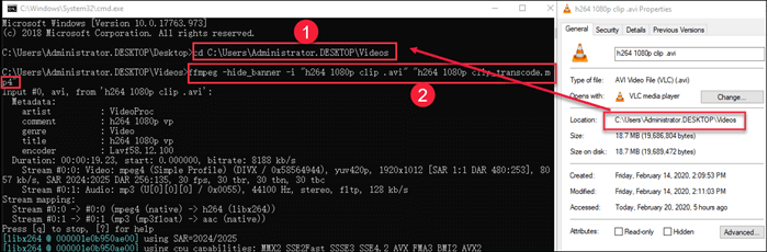 Step 3. Enter ffmpeg -hide_banner -i "my_movie.avi" "h264 1080p my_movie.mp4" and then press Enter. FFmpeg starts to convert AVI to MP4 on Windows for free.