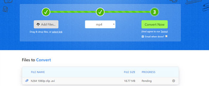 ConvertFiles is an easy-to-use online AVI to MP4 converter, with which you can fast convert AVI to MP4 in H.265 or MPEG-4 formats. This can help you save a lot of hard disk space. Besides, it has good performance in the transcoding of images, drawings, documents, archive files, and more. To speak of the downsides, there is no access to change the resolutions, bitrate, aspect ratio rate…and it can't convert video files over 250MB.