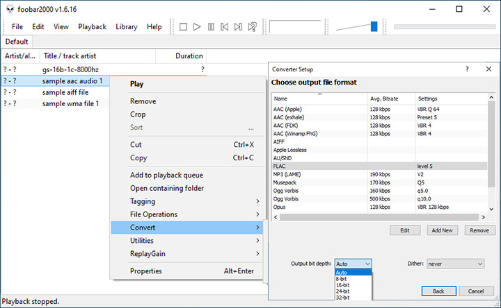 Foobar2000 (fb2k or f2k) is a freeware media player, but its conversion capabilities give it a place on this list of the best free MP3 converters. With the converter component installed, you'll find the converter functionality in the context menu. foobar2000 provides a free encoder pack to support various popular formats, such as MP3, AAC, CD Audio, WMA, FLAC, WavPack, and more. Going further into the encoder settings, you can set attributes like bit rate mode, format, quality, bit depth, etc.