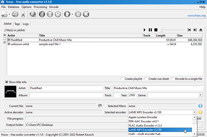 Fre:ac is a lightweight and free MP3 converter program and CD ripper. It's a program for just over 7MB. Besides MP3, this program allows you to convert audio files between various formats, including ALAC, Ogg Vorbis, AAC, Bonk formats, and more. You can use the presets in the program or the customizable options to get the outputs you want. Fre:ac provides settings like encoder, overall quality, and filters.