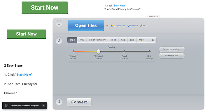 Online Audio Converter is another best free MP3 converter online you can use directly in your browser. Compared with other online audio converters, it offers a series of advanced features, including output quality, bitrate mode, sample rate, channels, and effects. You can even edit track info as a non-registered user. However, based on our test, you'll see a prompt window saying "Server connection interrupted" very often when editing metadata.