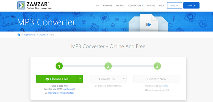 However, like most online tools, Zamzar has a limitation on file size. You can only convert audio files under 50 MB with the free plan. Besides that, Zamzar doesn't offer customizable MP3 settings either. But overall, it's ideal for users who need to convert audio files to MP3 format on the go.